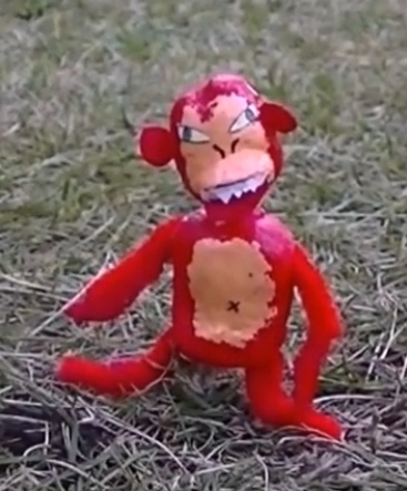 外見は両目が少々斜視気味のつり目と出っ歯が特徴の赤い猿の人形。