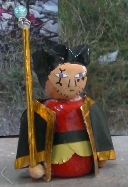 三つに分かれた逆立った髪型と、右目に骨、左目の下に三つの逆三角形のような刺青が特徴の王様の人形。