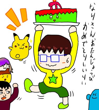 モンスマ作者 キャラクターはなりの他にナーリィの形のケーキ、ピンクンの形の蝋燭、サーウ、ナリット、かずき、ポリス