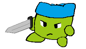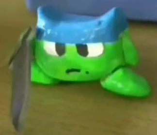 一頭身で緑の肌と青いバンダナが特徴のカエルの人形で、剣を所持している。