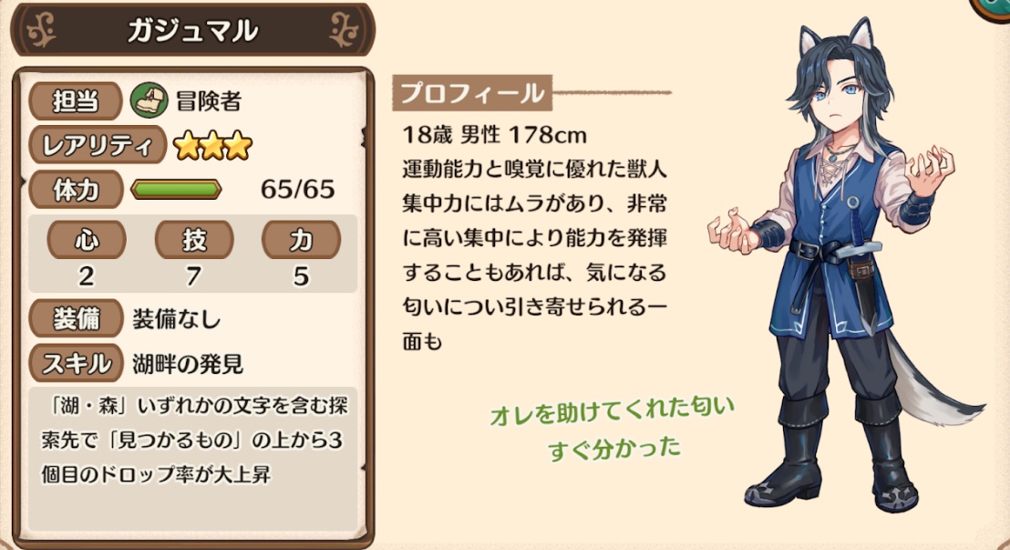 18歳 男性 178cm 運動能力と嗅覚に優れた獣人 集中力にはムラがあり、 非常に高い集中により能力を発揮 することもあれば、気になる 匂いについ引き寄せられる一面も |