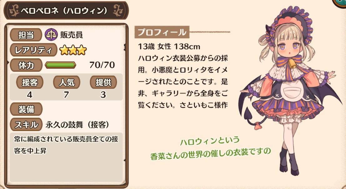 スキル「永久の鼓舞(接客)」により常に編成されている販売員全ての(自分含む)接客が「2」上昇します。