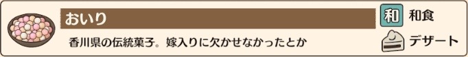 | 料理カテゴリ | 和食 | 提供カテゴリ | デザート | 図鑑番号 |
