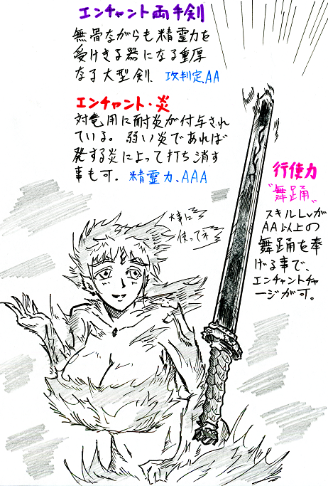 おおむね拵えはミズハ式の刀剣に準ずるが、刃がすべて鋸刃になっているのが最大の特徴。竜人はミズハの鱗人の中でも強靭な鱗を有する。生来の膂力では竜鱗を徹せぬ青鬼たちが、仇敵である竜人どもを斃すため苦心の末開発した変わり刀がこれであるとされる。 |