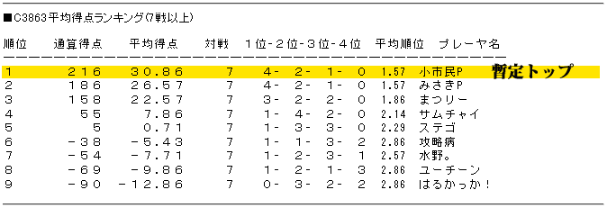 順位 通算得点 平均得点 対戦 1位-2位-3位-4位 平均順位 プレーヤ名