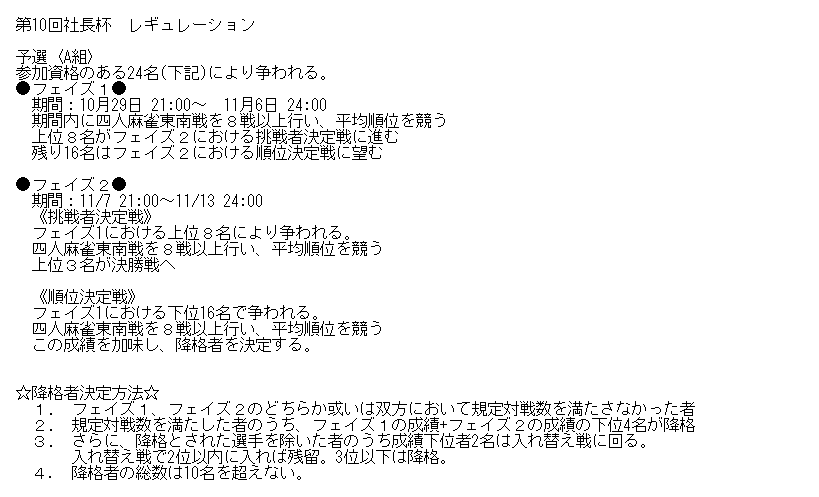 ※予選の最終日から3日以内(各日21:00~23:00、または卓内で相談のうえ定められた日時)に面子が揃わない場合、