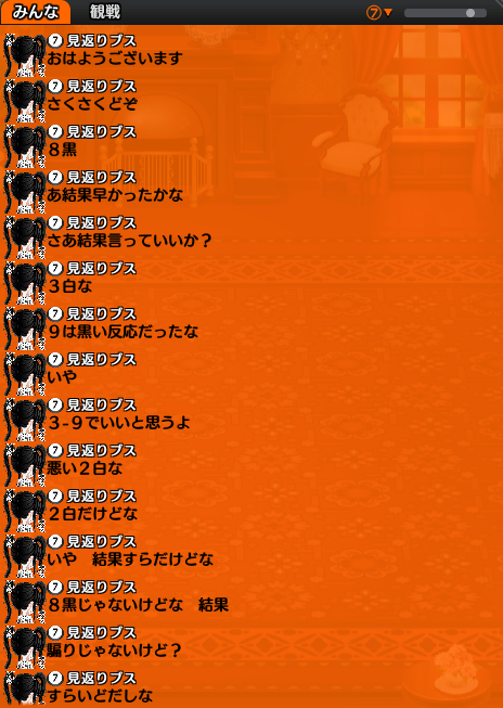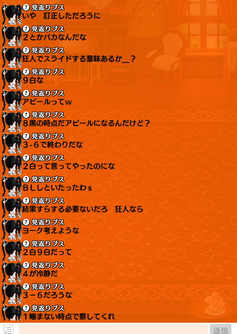 初日に結果騙りするも大失敗し信用を失った挙句、騙り黒の村人を吊らせてしまう。 その事に村人が大ブーイングするも反省せずに逆ギレした挙句、謎のBL宣言で逃亡。 | ||