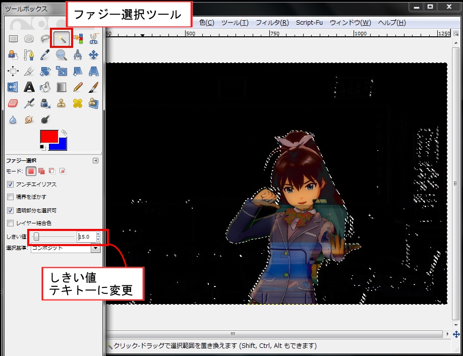 GIMPつかってアバウトにキャラクター部分だけ切り取っていく。