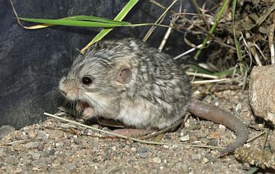 イツユビコミミトビネズミは岩の多い砂漠地帯に棲息している。