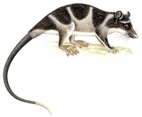 体色は薄いねずみ色で、体上面の背筋に沿って1本の黒い線があり、体側には4本の幅広い黒色の横帯がある。後足の指間には水かきがあり、半水生で泳ぎが巧みである。