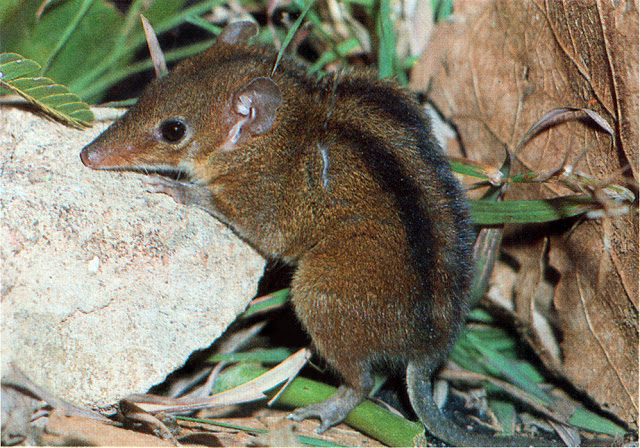 体毛は背部が茶色で3本の暗色の帯がある、腹部は灰色。