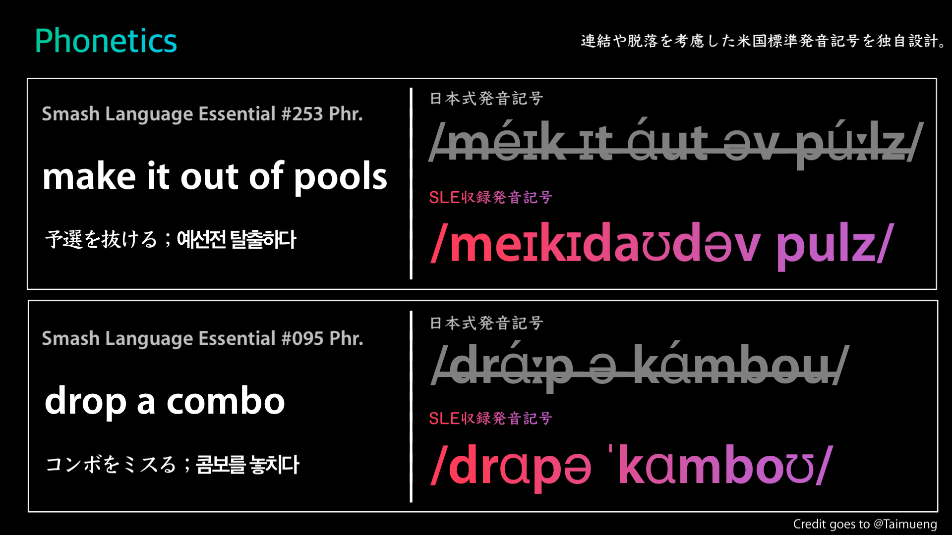 また、フレーズに関しましては連結や脱落を考慮した米国式発音記号を独自に設計しました。