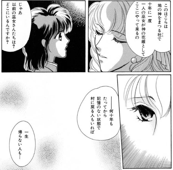 作中に出てくるギア族は年々出生率が減っており、人間の村から10年に1度「巫女」を募っていた。「巫女」は柱に封印され、懐妊し眠り続けるギア族の女性たちを見守り続ける「人柱」の役目を任されることになる。