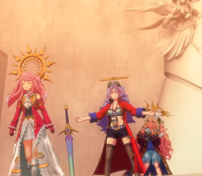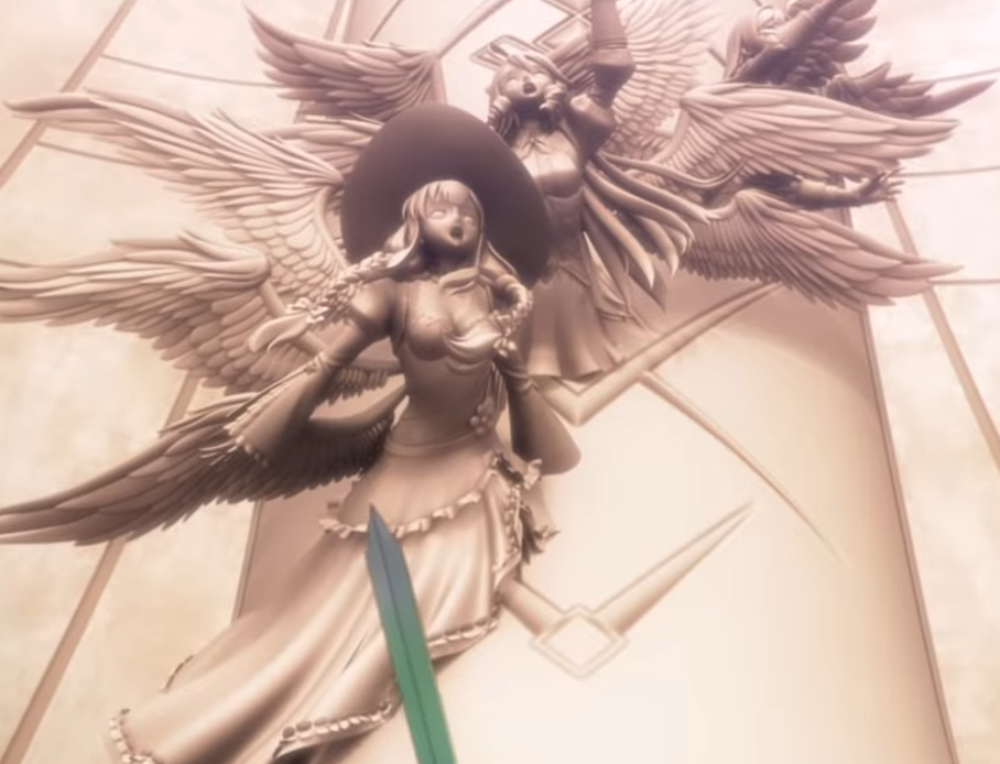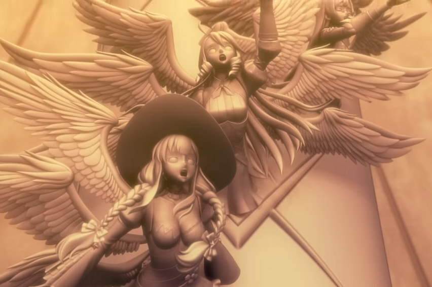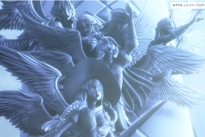 ミカエルに追い詰められ対峙するラミエルの背後には、石化した天使長たちの像。