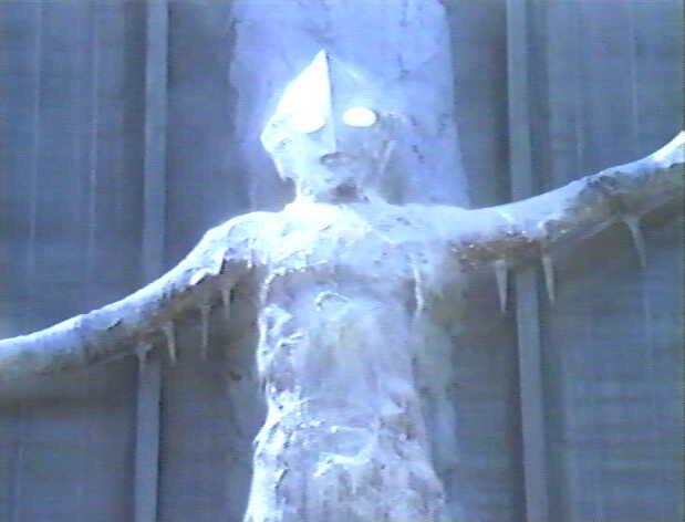 冷凍星人グローザムに対峙するウルトラマンメビウスですが、全く刃が立たずに槍で腹を刺された上に凍らされてしまいます。