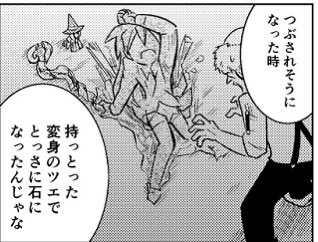 石化すること自体は本人の意思でできるものの、石化解除自体は自分ではできない為、ドロシーちゃんは主人公の助けがあり何とか戻れました(もし仲間がいないキャラが同じことをした場合は、その場で詰みになります)