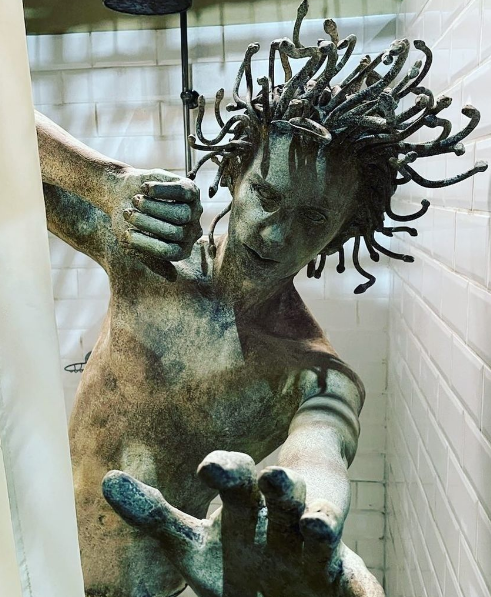 シャワールームでシャワーを浴び終わったゴーゴン(男性)が、シャワーカーテンを開けた時に自分を鏡で見てしまい、全裸のまま自分が石化する。