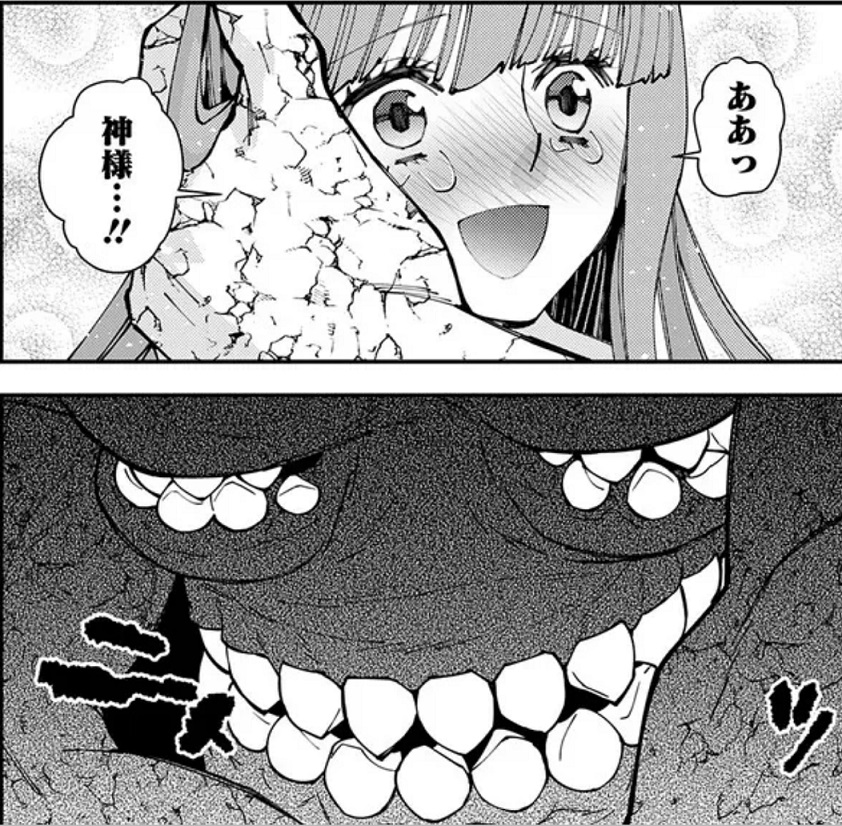 外道な聖女が相手のためか、像は真っ二つにされ崩れ落ちてしまうなど破壊描写が生々しいです。