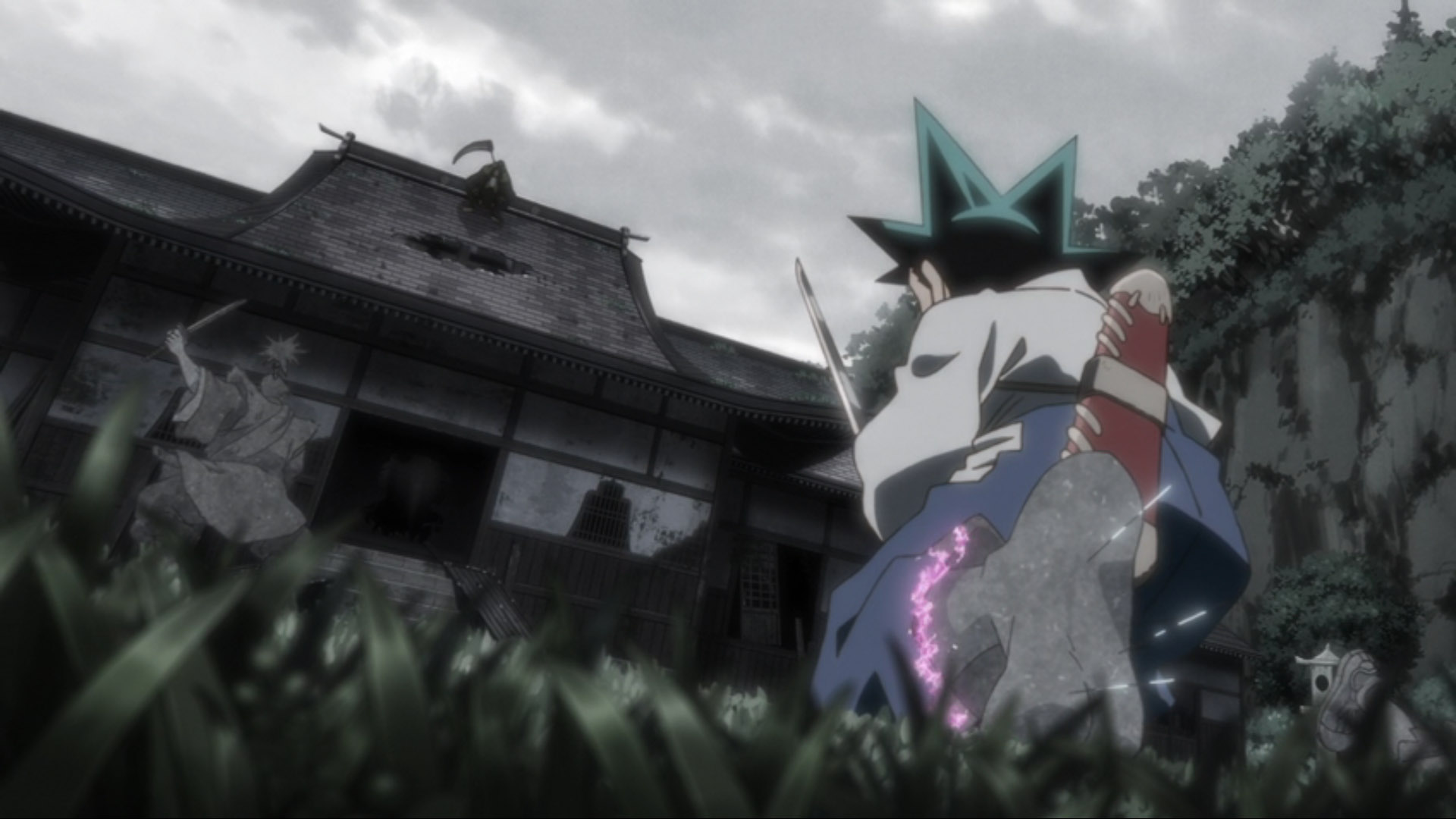 仲間たちが次々と石化され、ヤイバも立ち向かい何とか下駄で受け止めて石化を回避し続けますが、途中で逆の裸足状態の足を出してしまい、足の裏に毒針が刺さりじわじわと石化していきます
