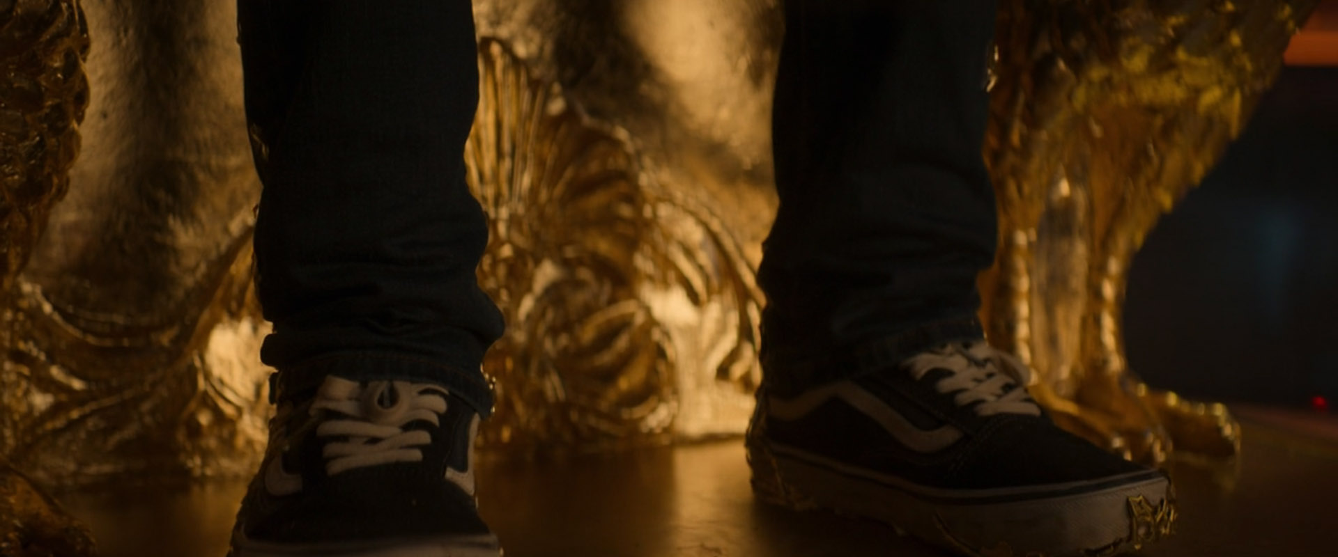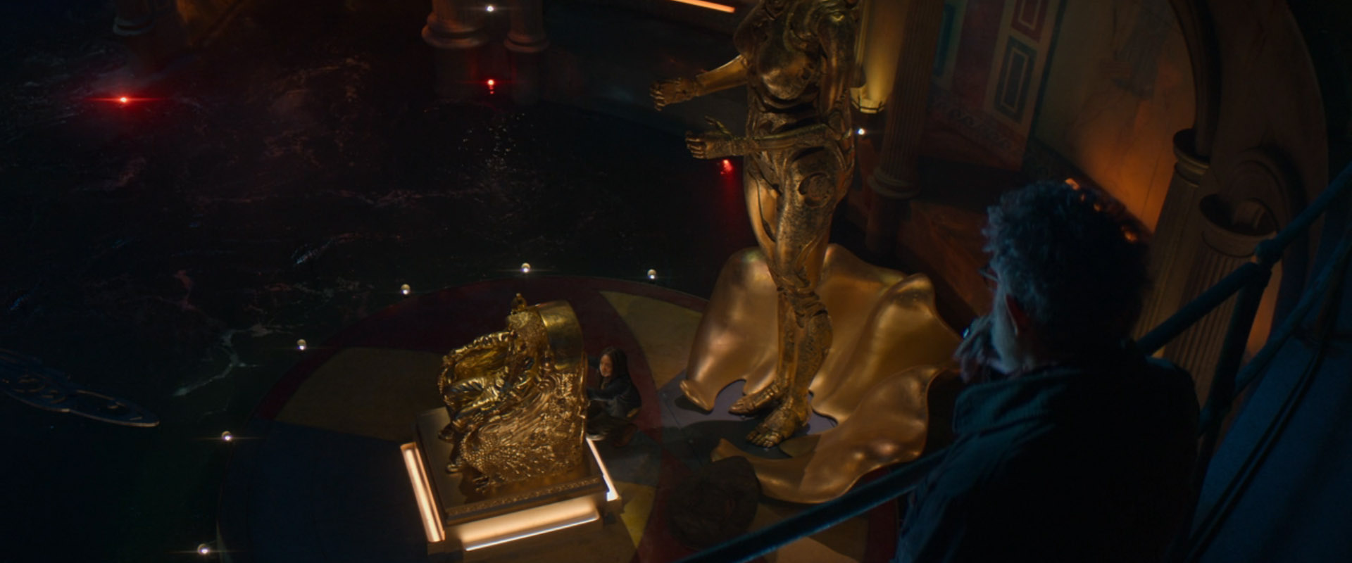 黄金像の横で遊ぶ2人