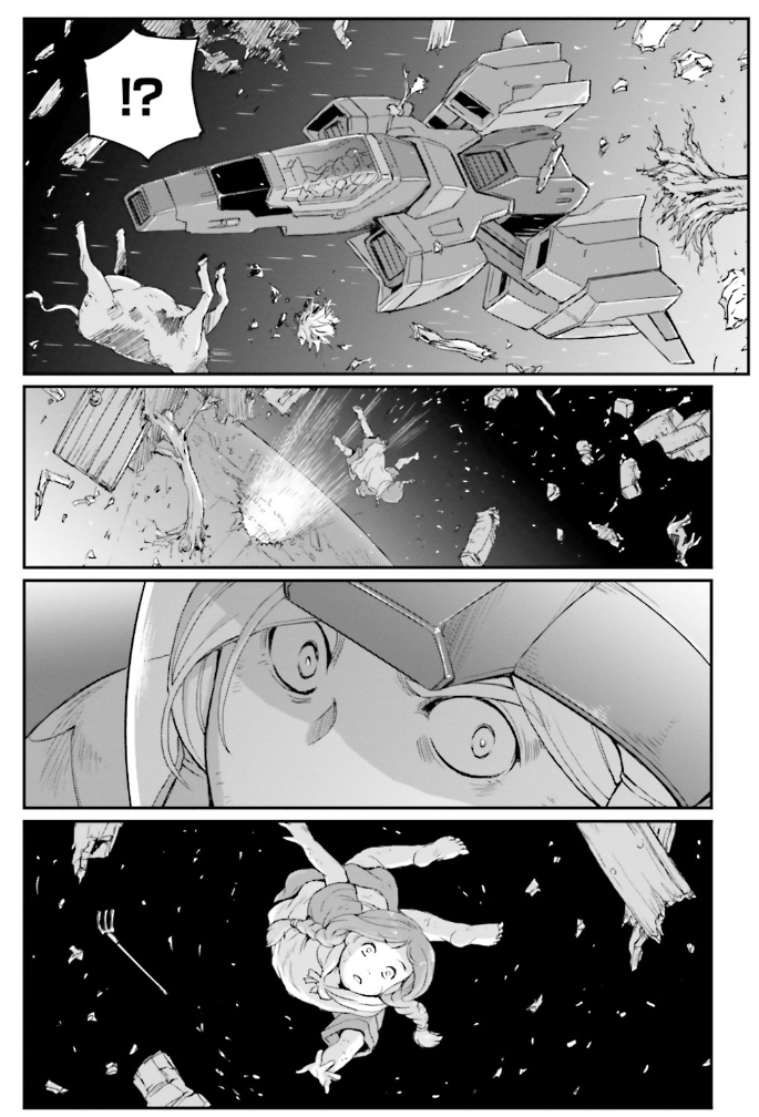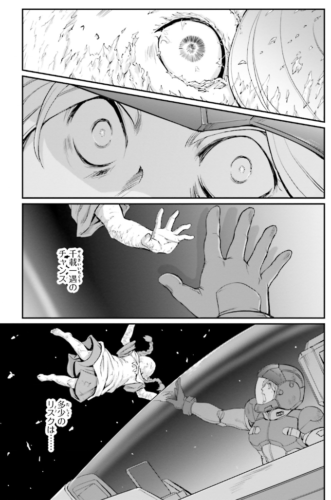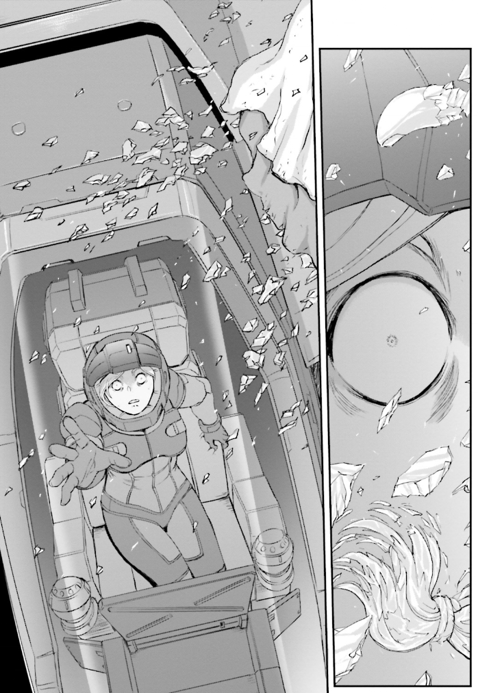 モビルスーツの戦闘の余波でコロニーに穴が空き、三つ編みの女の子が宇宙に放り出された後凍っていき、手を伸ばしたまま粉々に壊れてしまいます。