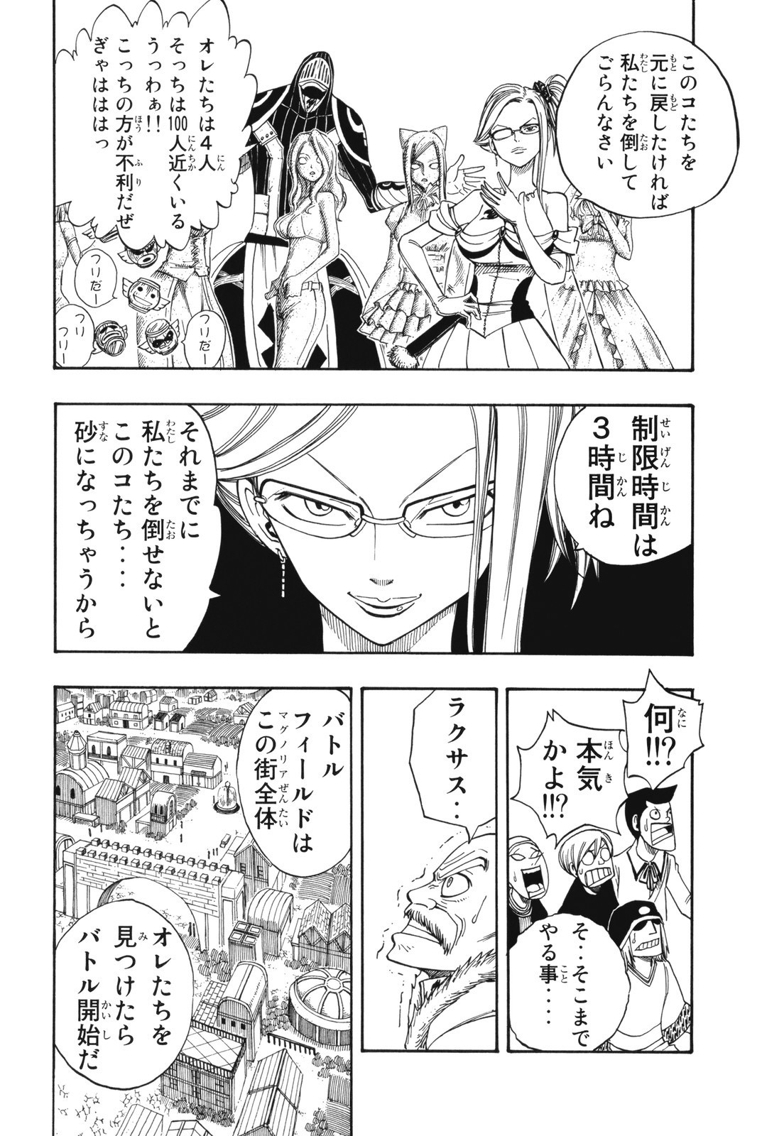 フェアリーテイルがマグノリアの収穫祭のミスコンに参加しますが、ラクサスたちが乱入し、石化され人質にされてしまいます。