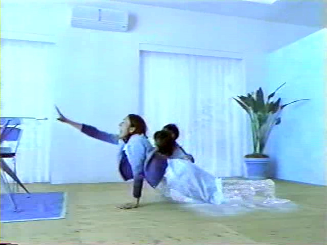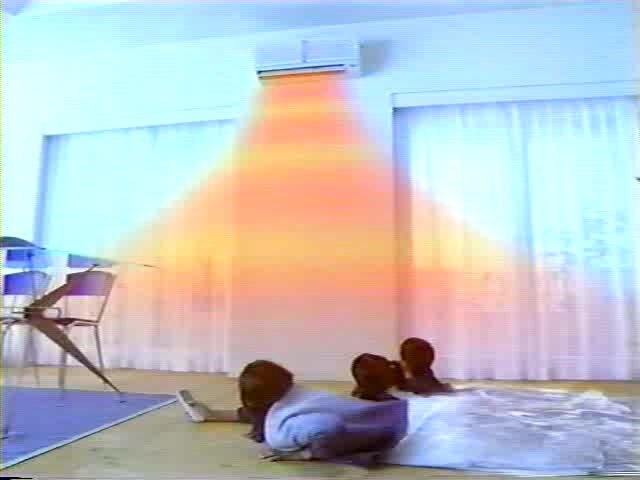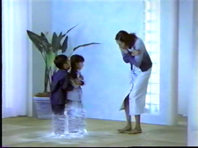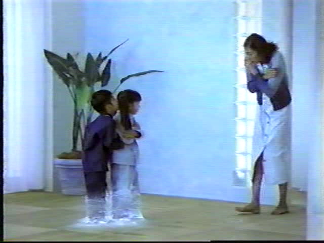 親子(母と娘と息子)がリビングに入ったところ寒かったので膝のあたりまで凍りつきます。
