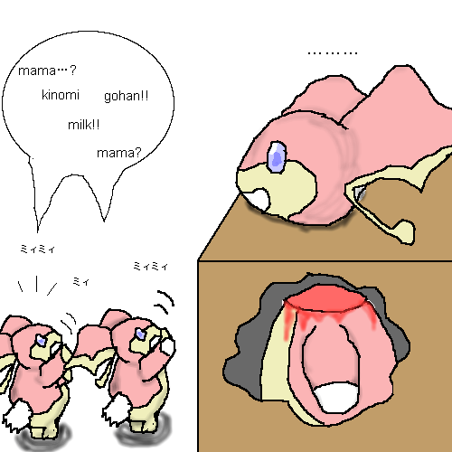 - ↑どんなに泣きわめいても駄々をこねても木の実どころか水すら与えられない子タブンネ達が尚も食べ物をねだり箱をくいくいゆすった拍子にママの首がコロリ…となって現実に気付き絶望するのか最後まで気付かず泣きながら飢えて逝くのか… -- 名無しさん (2013-01-25 23:37:14)