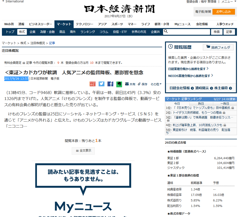 2017年9月26日9:12ころ カドカワ株式会社社長川上量生(@kawango)による投稿