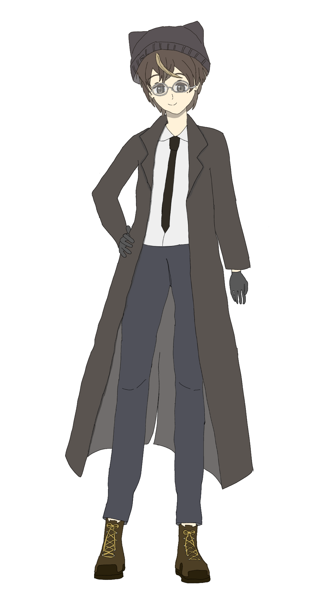 ニット帽にメガネがトレードマーク。黒髪+くすんだ茶色のメッシュ。