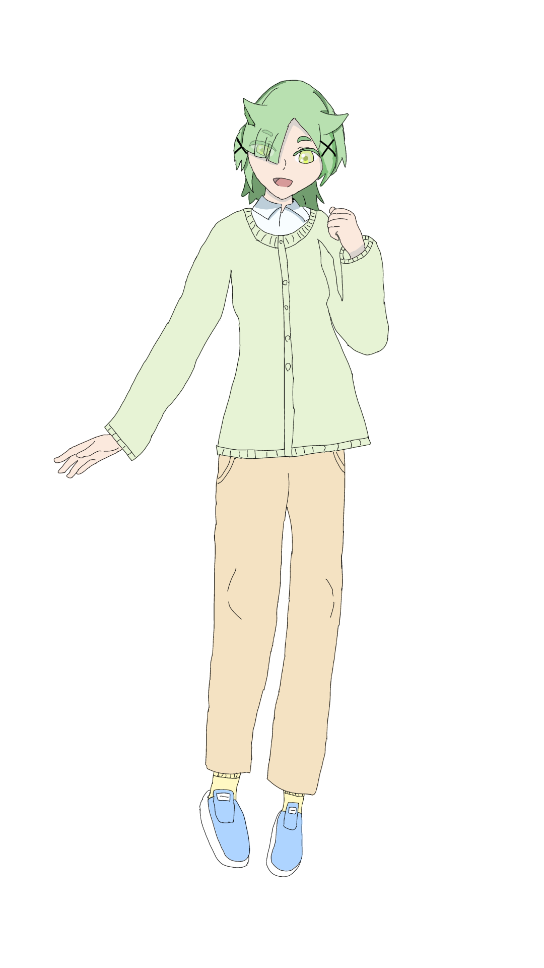 普段は緑掛かった黒髪で、右目がメカクレになっている。犬耳に近いケモ耳のような髪型が特徴的。
