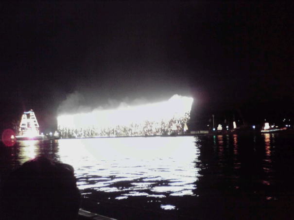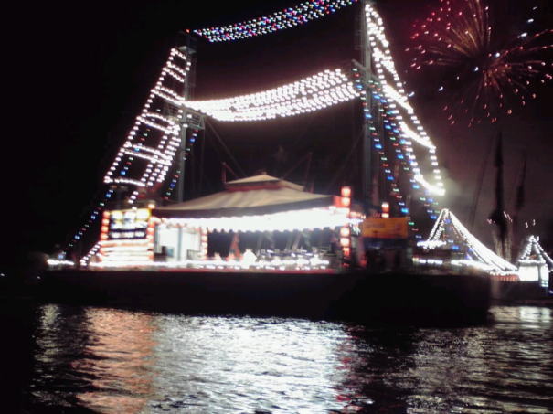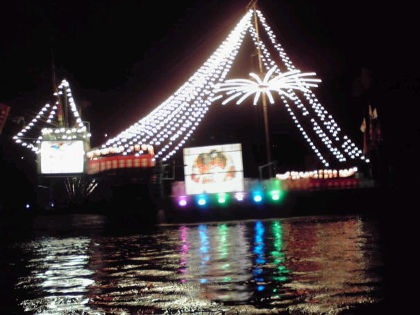 この日の為に「大船渡丸」をイルミネーションで、「日本丸」風に飾りつけ船内特設ステージには地元出身歌手の「大沢桃子さん」を迎えてその歌に合わせながら沢山の踊り手達が、踊りを披露していました。