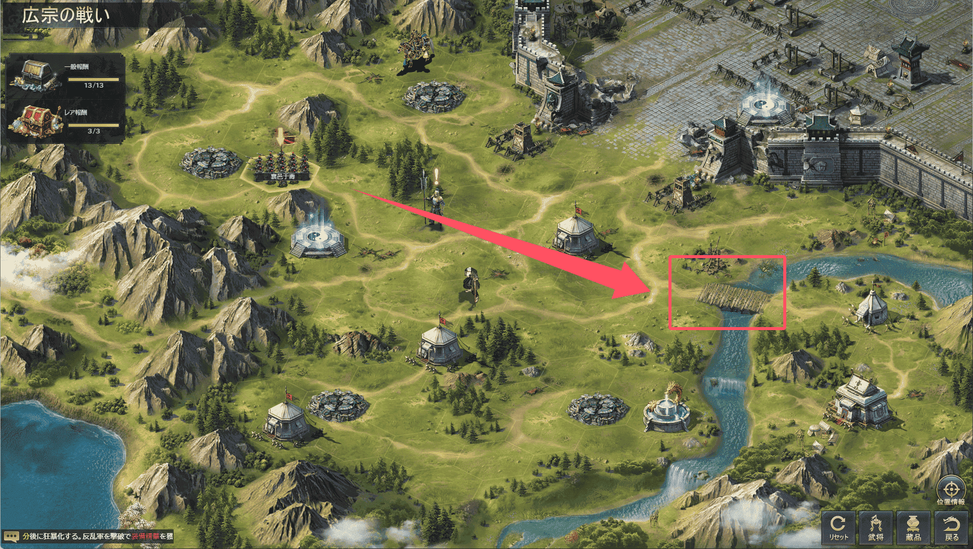 祭壇を全て破壊したら、川に橋が出てきますので、川の向こうにある宝箱などを獲得してクリア!