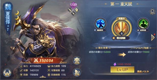 各武将の天賦をレベルアップさせる事ができます。