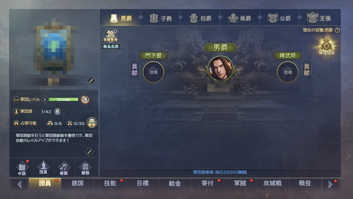 軍団長の官職は「男爵、子爵、伯爵、侯爵、公爵、王候」の6段階に分かれています。