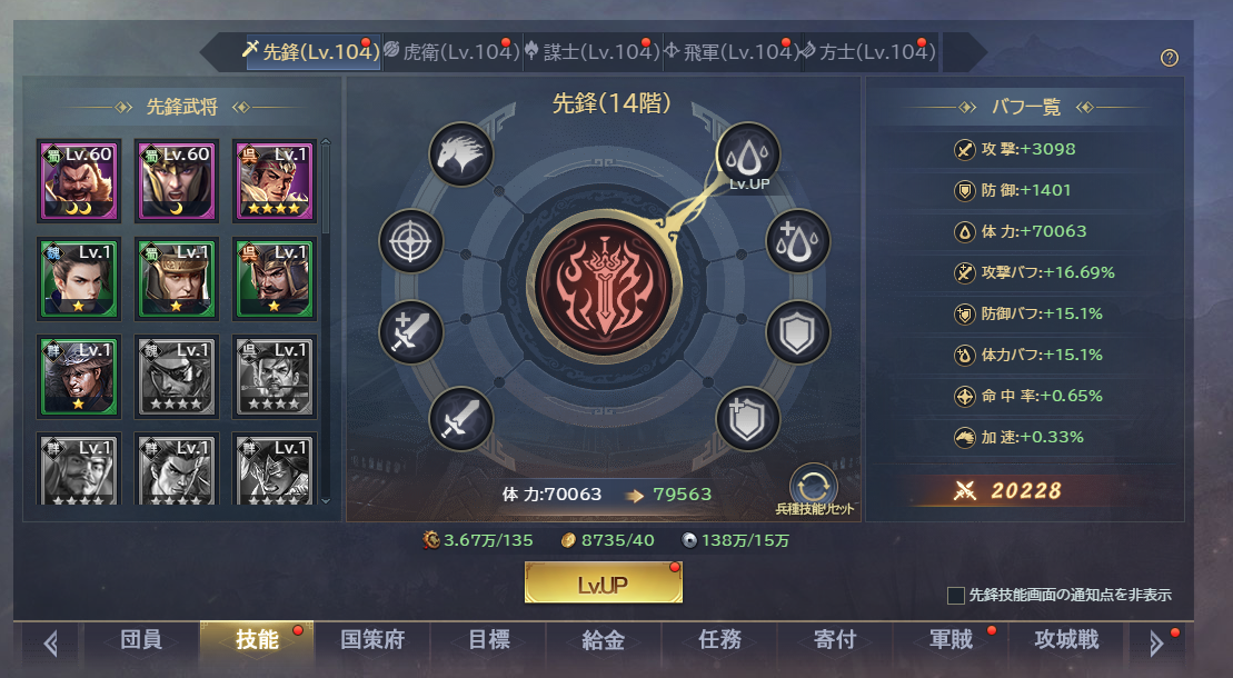 「技能」では5つの武将職種に分けられ、技能レベルを上げるにつれ、武将のステータスにバフが与えられます。