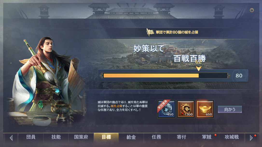 また、官職に応じて「俸禄」の報酬内容が異なるため、詳細は軍団俸禄にて確認ができます。