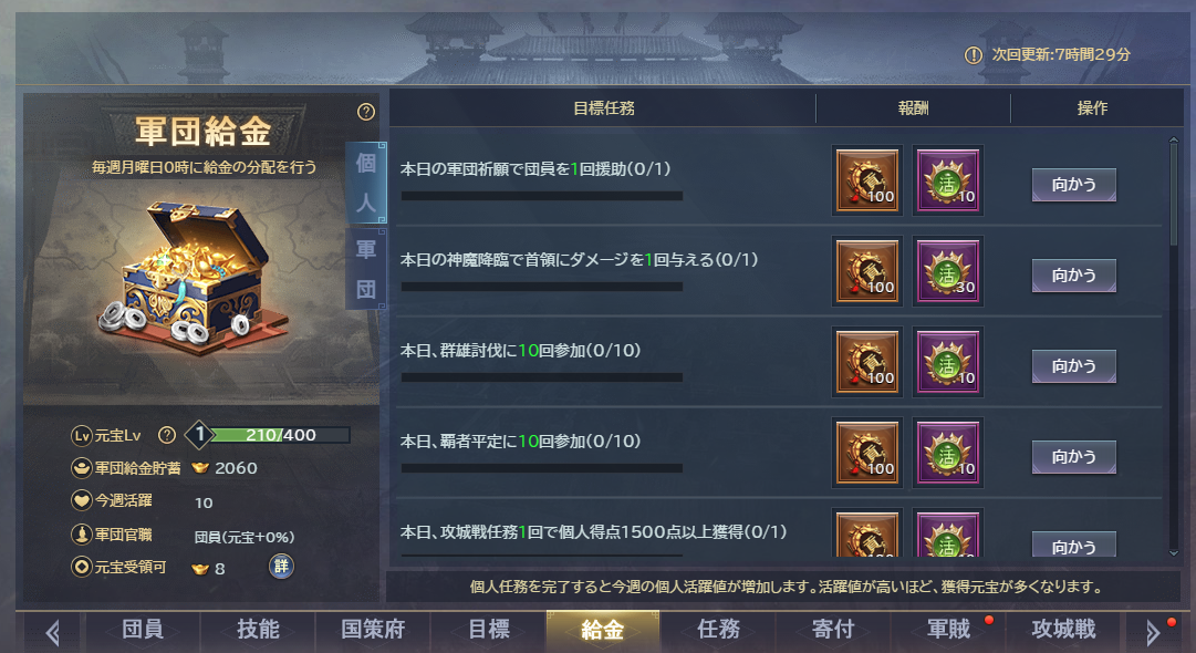 更に、軍団のレベルや官職に応じて報酬が豪華になるため、入りたい軍団を見極めて加入しましょう!!