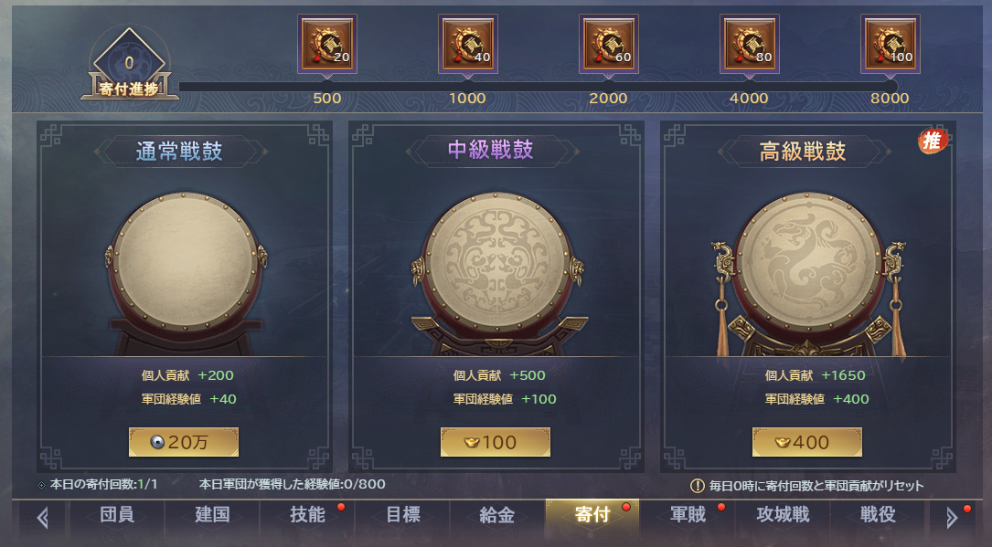 「寄付」では「通常戦鼓」「中級戦鼓」「高級戦鼓」の3つに分けられ、1日1回寄付する事ができます。