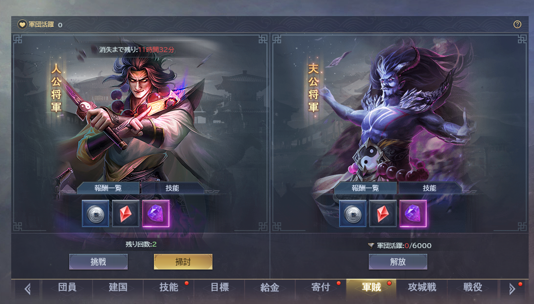 軍団の「戦役」は攻略すると「元宝、軍団幣、軍団貢献値」の報酬を獲得できます。