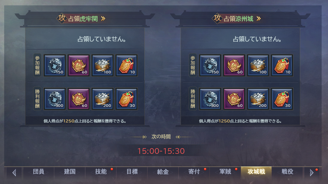 次回開催される攻城戦の確認ができ、「州城、都城」からランダムに2つの城で開催されます。