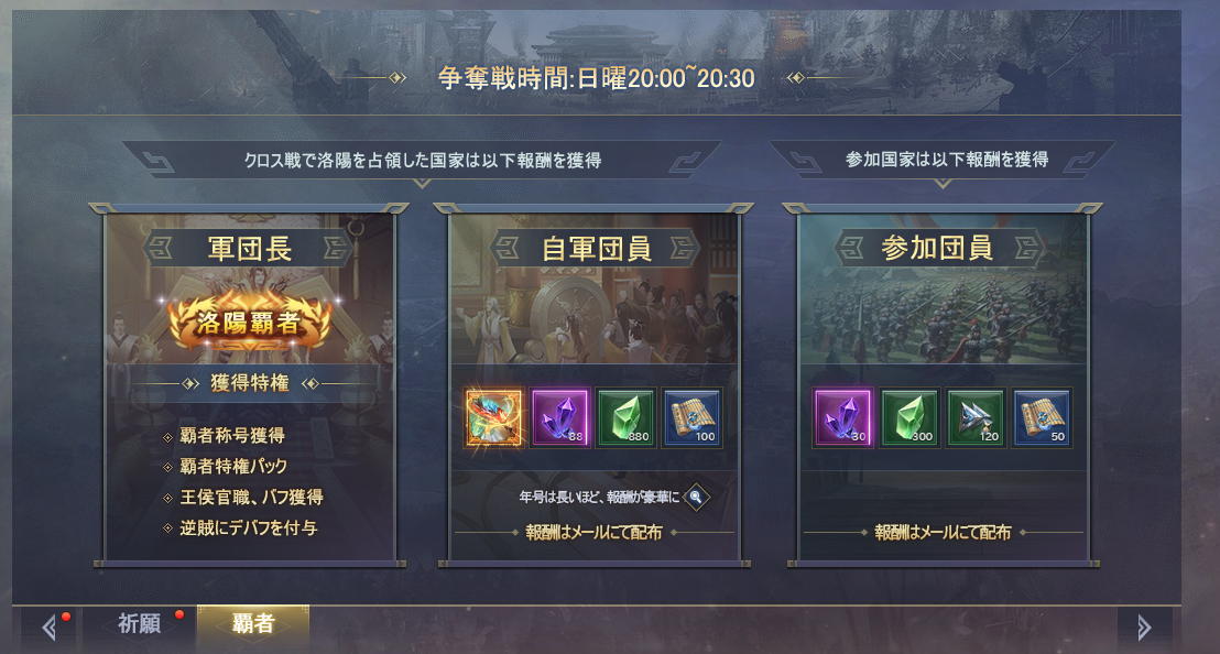 「覇者」では前回のクロス戦にて「洛陽」を占領した軍団に豪華報酬を与えられます。その他クロス戦に参加した軍団は「参加報酬」を獲得できます。