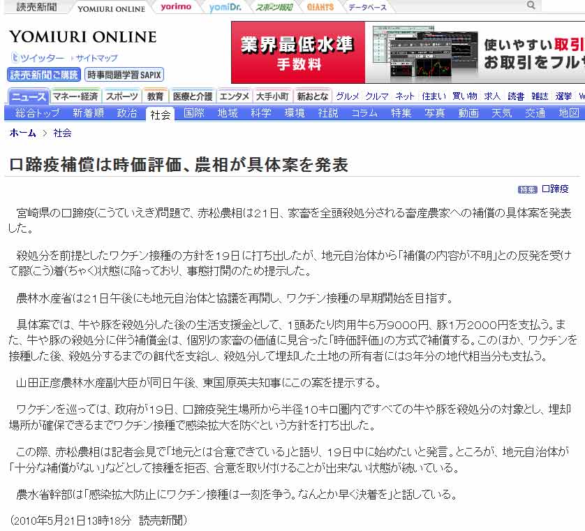 宮崎県の口蹄疫(こうていえき)問題で、赤松農相は21日、家畜を全頭殺処分される畜産農家への補償の具体案を発表した。