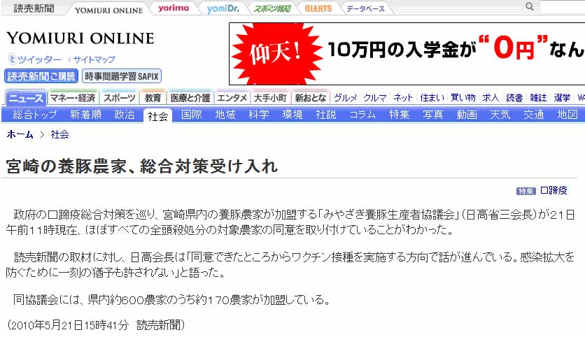 「宮崎の養豚農家、総合対策受け入れ(読売新聞社)」をウィキ内検索