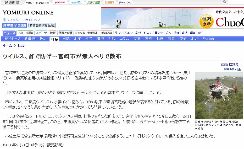 宮崎市が必死の口蹄疫ウイルス侵入防止策を展開している。同市は21日朝、感染エリアとの境界を流れる一ツ瀬川沿いに、農薬散布用の無線操縦ヘリコプターで感染防止に効果があるとされる酢を空中散布する「水際作戦」を始めた。