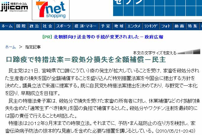 民主党は21日、宮崎県で口蹄(こうてい)疫の発生が拡大していることを受け、家畜を殺処分された生産者の損失を国が全額補償することを盛り込んだ特別措置法案を今国会に提出する方針を決めた。議員立法で来週に提案する。既に自民党も特措法案提出を決めており、与野党で一本化を図り、早期成立を目指す。