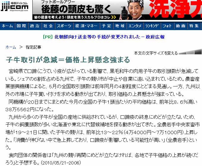 九州から多くの子牛が全国の産地に供給されているが、口蹄疫の終息にめどが立たないため、子牛の飼養頭数が多い北海道や東北に代替候補地を探る動きが出てきた。全農岩手中央家畜市場が19~21日に開いた子牛の競りは、前年比13~22%(4万4000円~7万1000円)上昇した。「消費が伸びない中で急上昇しており、口蹄疫が影響している可能性が高い」(全農岩手)という。