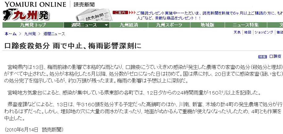 宮崎県内は13日、梅雨前線の影響で本格的な雨となり、口蹄疫(こうていえき)の感染が発生した農場での家畜の処分(殺処分と埋却)がすべて中止された。処分が本格化した5月以降、処分数がゼロになった日は初めて。国は県に対し、20日までに感染家畜(疑い含む)の処分完了を指示しているが、約3万頭が残ったまま。梅雨の影響は予想以上に深刻だ。