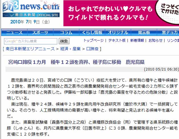 鹿児島県は20日、宮崎での口蹄(こうてい)疫拡大を受けて、県所有の種牛と種牛候補計12頭を、喜界町の民間施設と西之表市の県農業開発総合センター熊毛支場の2カ所に6頭ずつ分散移転させると発表した。伊藤祐一郎知事は「鹿児島の畜産を守るための危険分散」と説明している。