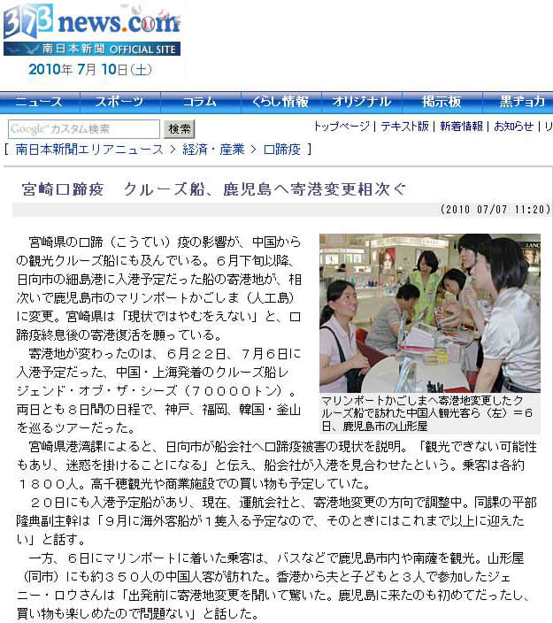 宮崎県の口蹄(こうてい)疫の影響が、中国からの観光クルーズ船にも及んでいる。6月下旬以降、日向市の細島港に入港予定だった船の寄港地が、相次いで鹿児島市のマリンポートかごしま(人工島)に変更。宮崎県は「現状ではやむをえない」と、口蹄疫終息後の寄港復活を願っている。